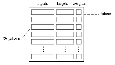Datasets can (but aren't forced to) be made of gnn_input : Reading and handling of sets of vectors. s. As a particular example, gnn_simple_set : A simple implementation of datasets. is built upon three samplers (one for inputs, targets and weights).