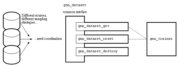 The gnn_dataset : Datasets for Training. and its functions provide a common interface, or protocol, for different types of datasets. A dataset can be just a sampler from three different sources (input, output and weight), or a shuffler, or a preprocessor, etc. They just provide a logic view of the underlying sample sources, and they have to manage them without mixing them up.